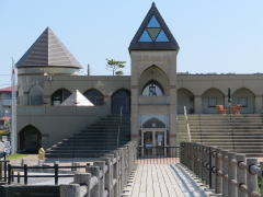 御宿海岸から「メキシコ記念塔」を望むことができ 写真「月の沙漠記念像(1)」の左台地上に小さく写っている
