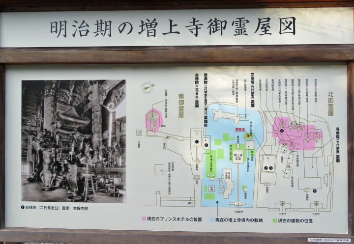 墓所には、2代秀忠公・6代家宣公・7代家継公・9代家重公・12代家慶公・14代家茂公の6人の将軍のほか、崇源院(2代秀忠公正室、家光公の実母、お江)、静寛院宮(14代家茂公正室和宮)ら5人の正室、桂昌院(3代家光公側室、5代綱吉公実母)はじめ5人の側室、及び3代家光公第3子甲府宰相綱重公ほか歴代将軍の子女多数が埋葬されています。