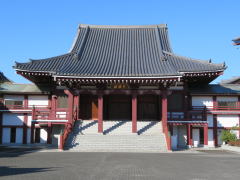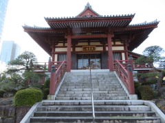 石段を登ったところが2階で本堂、3階が道場、1階は壇信徒控室、地階が宝物展示室となっている