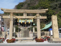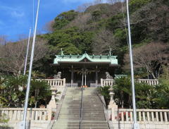 後北条氏の頃、しばしば房総半島の里見水軍が、三浦半島に攻撃をかけてきましたので、それを防ぐために、この明神山に水軍を配置しました。山頂には、この神社の奥宮があり、その左手に「勝海舟断食の場」の標柱が立っています。